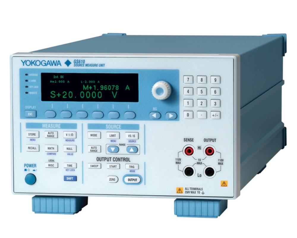 The GS610 is a highly accurate and highly functional programmable voltage/current source that incorporates voltage/current generation and measurement functions. The maximum output voltage and current are 110 V and 3.2 A, respectively. Evaluation of over a wide range of basic electrical characteristics is possible because the GS610 can operate as a current source or a current sink.