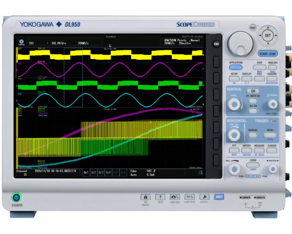 Only a ScopeCorder has the right combination of channel count, input types, triggering, and recording to tackle the job of electromechanical systems development and troubleshooting. With its multiple measurement types, excellent performance, and high reliability, the DL950 ScopeCorder will quickly become the most valued instrument in your lab.